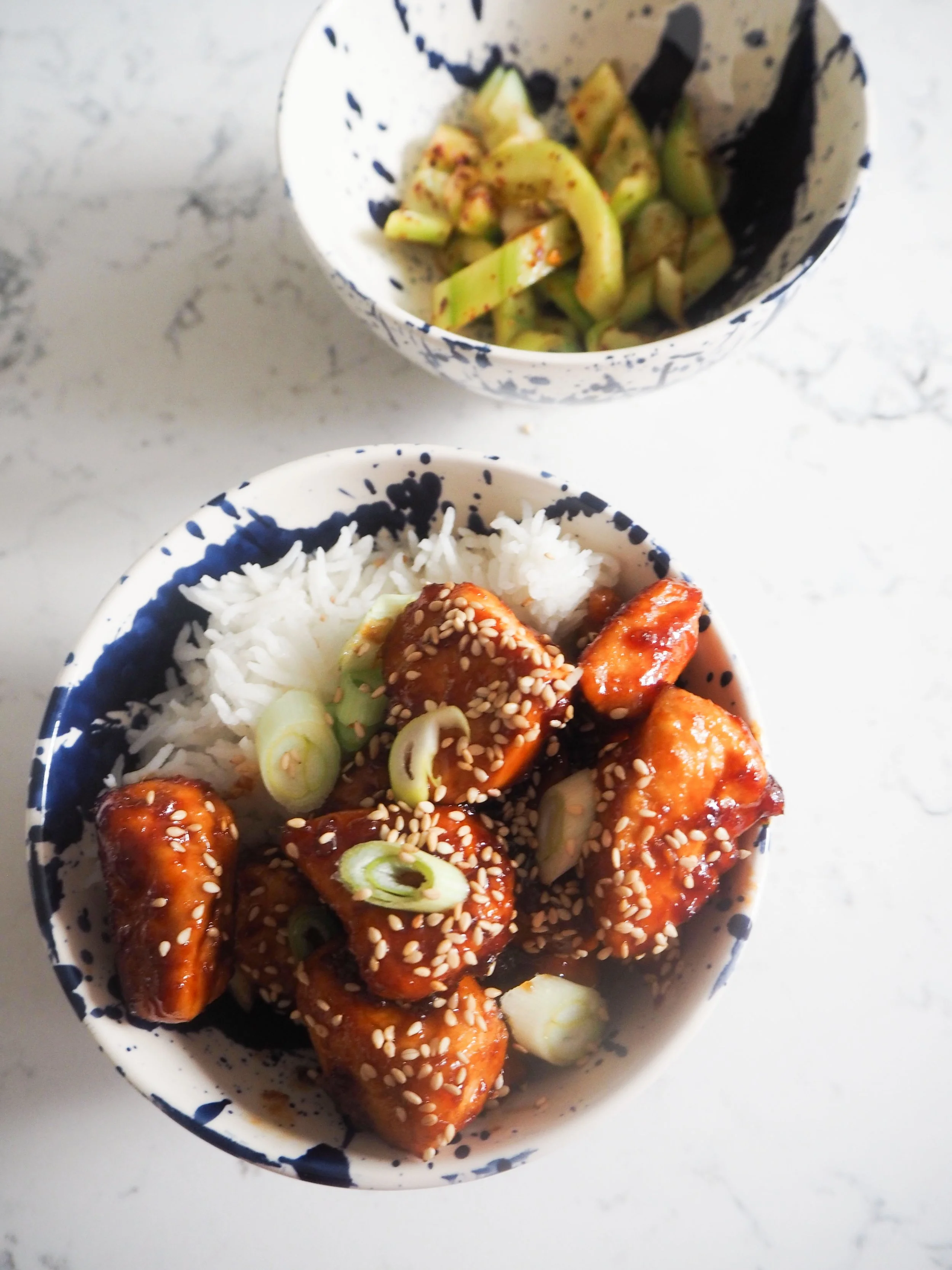 Allow to cool a little, as the sweet sauce is very hot straight from the pan. Serve with steamed jasmine rice and top with spring onions and sesame seeds.